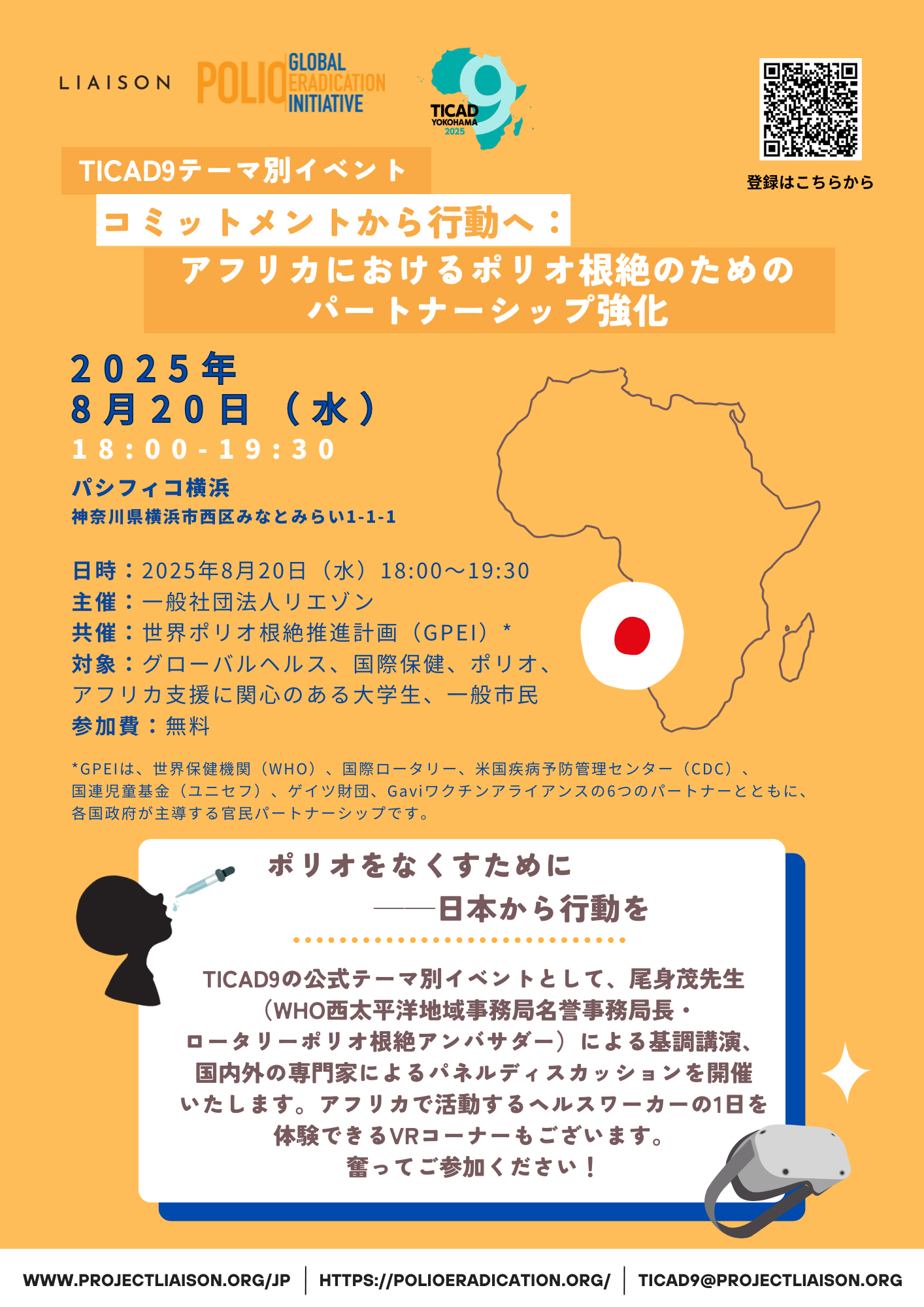 本イベントでは、日本とアフリカの関係者(外務省、厚生労働省、アフリカ各国の保健省・大使、世界ポリオ根絶推進計画:GPEIなど)を招き、日本が果たすポリオ根絶における国際的リーダーシップを強調しつつ、アフリカにおける変異型ポリオウイルス流行の根絶に向けた協力のあり方について議論します。基調講演と専門家によるパネルディスカッションを通じて、日アフリカ間の協力強化、保健システムの強化、資金動員、そしてポリオ根絶の最終段階に向けた戦略を探り、効果的なパートナーシップ形成を目指します。奮ってご参加ください!